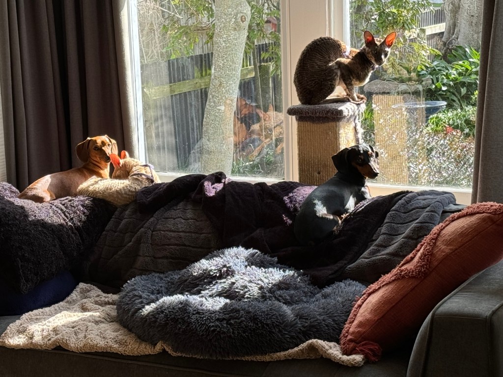 We are still living in Hawera, South Taranaki and whilst we have no human children we have always had cats, Cornish Rex cats to be exact. However we made the leap and adopted a Dachshund, or Sausage Dog we named Frida Plum, which was followed a year or so later by Frankie Blue. They are half sisters who love each other as well as their cat brother and sister, Basil and Marnie.